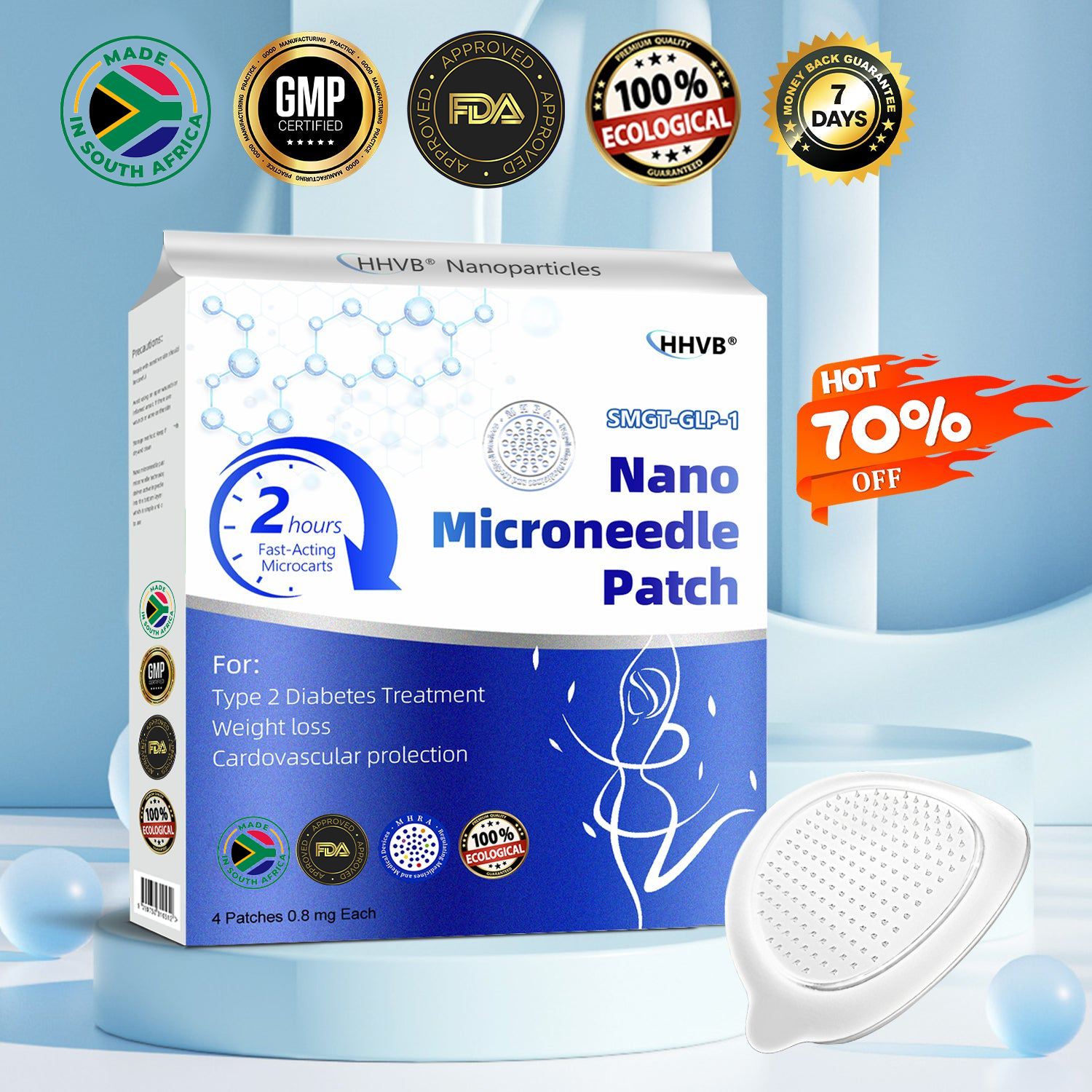 HHVB® Tirzepatide Nano-Microneedle Patch was carefully developed by a team of leading experts in obesity management. Drawing on years of in-depth research into the mechanisms of weight loss and metabolic health, this cutting-edge product is designed to support effective fat reduction, maintain stable blood sugar levels, and enhance overall metabolic balance.The formula also incorporates Matrixyl 3000, which delivers noticeable lifting and firming benefits, helping users improve both body contour and skin condition—empowering them to reach their health and wellness goals.